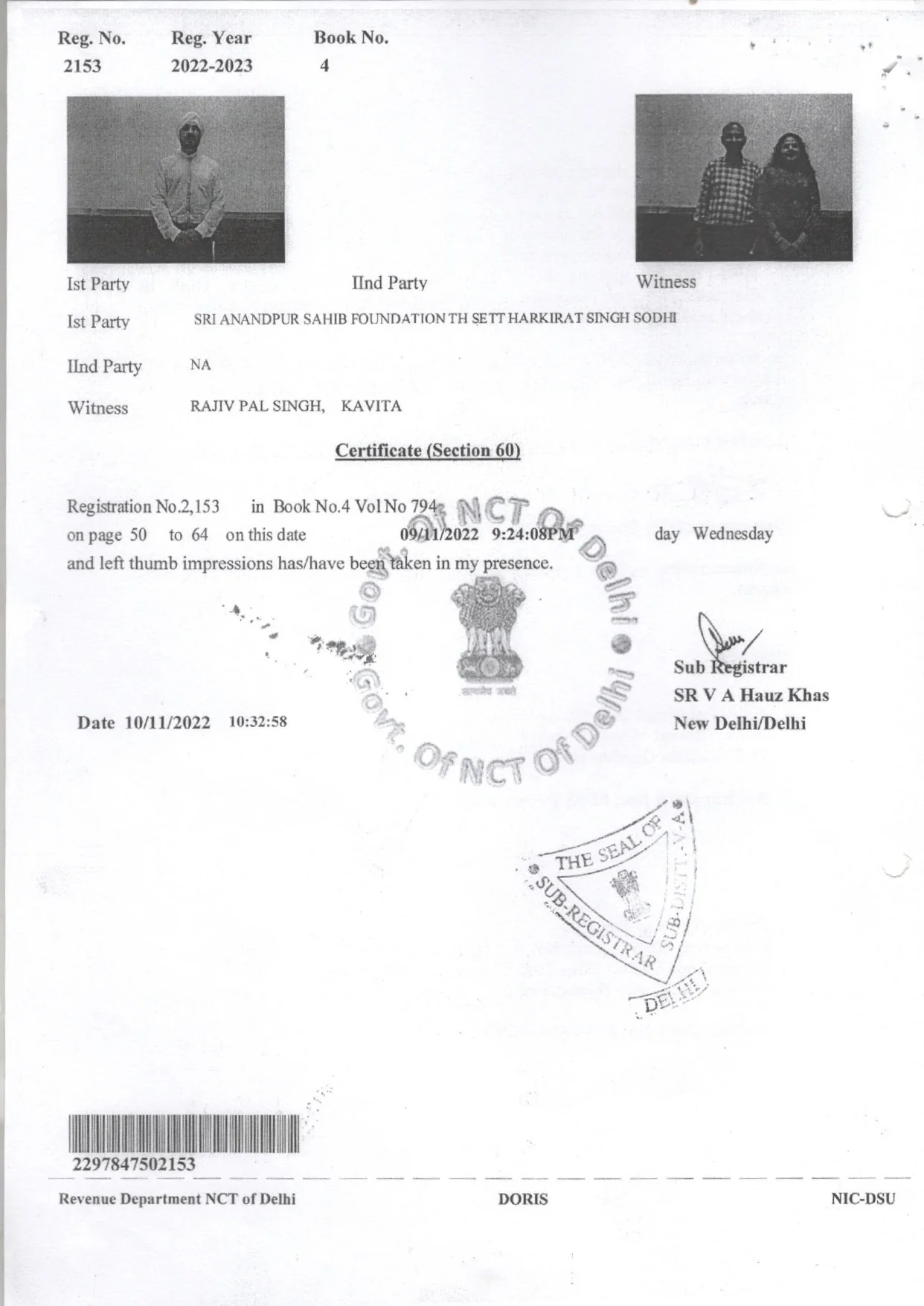 Sri Anandpur Sahib Foundation (SASF) is a non-profit, non-government, charitable trust registered under Registration No. 2153, Book No.4, Volume No. 794 on pages 50 to 64 on this date, 09.11.2022 by the Sub Registrar,